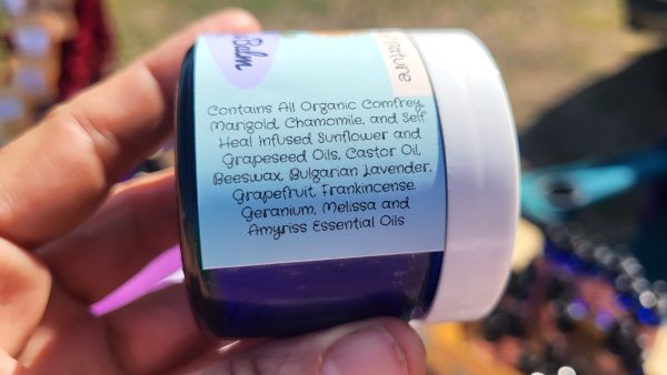 Full ingredients: All Organic and home grown Comfrey, Marigold, Chamomile and Self Heal Infused SunFlower and GrapeSeed Oils, Castor Oil, Beeswax, Bulgarian Lavender EO, Frankincense EO, Grapefruit EO, Geranium EO, Melissa EO, Amyris EO.