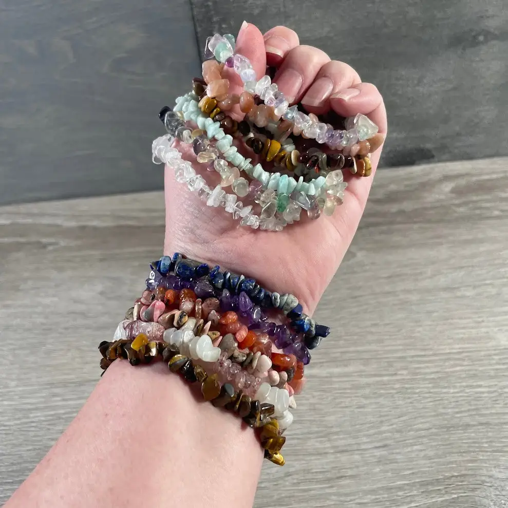 Each bracelet is made with genuine, colorful gemstone chips like amethyst, rose quartz, tiger’s eye, and more, creating a unique and stylish accessory. These stretch-fit bracelets are versatile for most wrist sizes, making them a popular choice for customers seeking meaningful crystal jewelry. Ideal gifts or adding a touch of vibrant energy to your collections. Stack them for a head turning look accentuating your unique style.