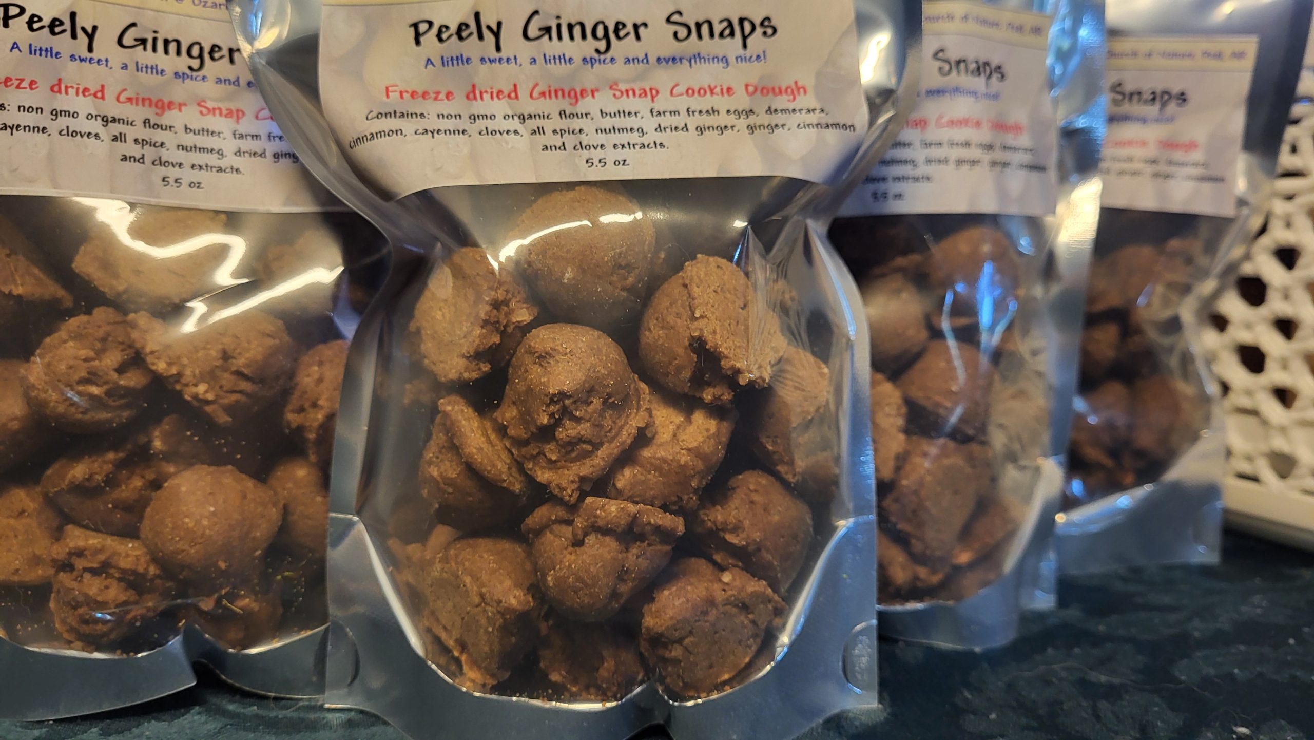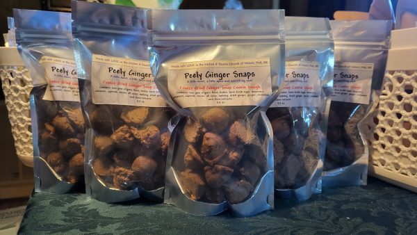 Peely Ginger Snaps are Freeze Dried Spiced Ginger Snap Cookie Dough. This is the equivalent of a dozen 1 ounce cookies.